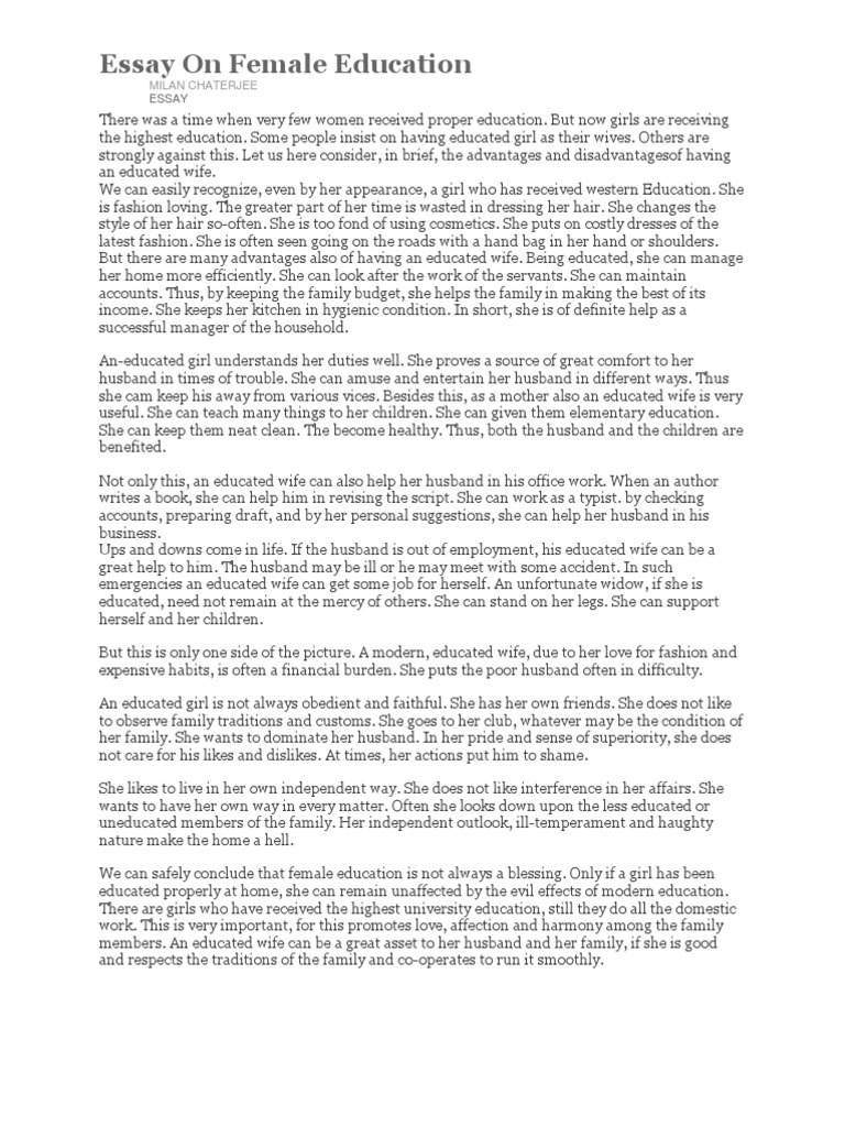 Women's education is important for the progress of our society and nation. Out of the total population of India, women education essay, women constitute almost half apart. But if we mention their educational status it is not pleasing. In this era, there is much progress seen in the field of women education but it is not sufficient. The past comprised of the ancient period and the medieval period. There was the liberty of education to women during the ancient time. Men and women had equal status in society. They performed any of the rituals together, women education essay. Women during that period were having free access to education. They learned many subjects. Some of the women had gained knowledge up to that extent which conferred them with the title of the rishi.
